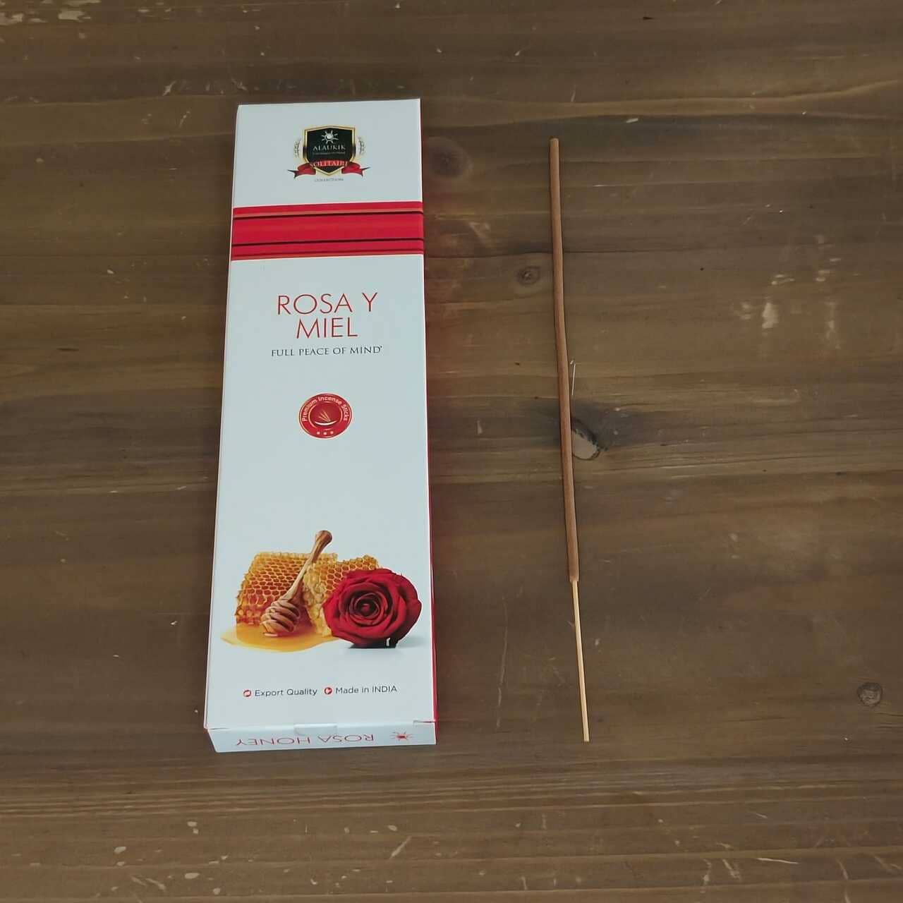 Elaborado artesanalmente en la India siguiendo recetas tradicionales transmitidas por generaciones, cada varilla es una obra de arte aromática que captura la esencia pura de los pétalos de rosa combinada con las notas cálidas y reconfortantes de la miel natural. El resultado es un incienso de calidad export que transforma cualquier espacio en un santuario de paz y dulzura.