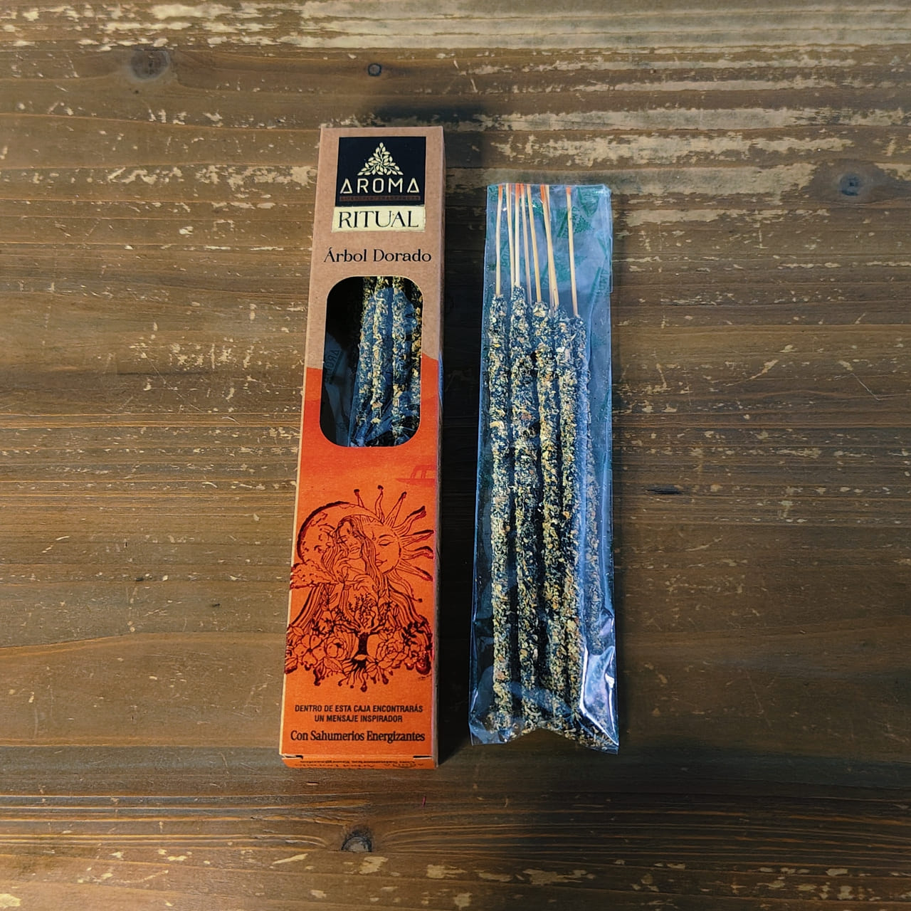 El Incienso Ritual Arbol Dorado Aroma Aroma es un incienso artesanal disenado para conectar con la energia de crecimiento y abundancia del arbol dorado. Presentado en cajita artesanal de 20g con mensaje inspirador, cada caja incluye un mensaje inspirador para acompanar tu practica.