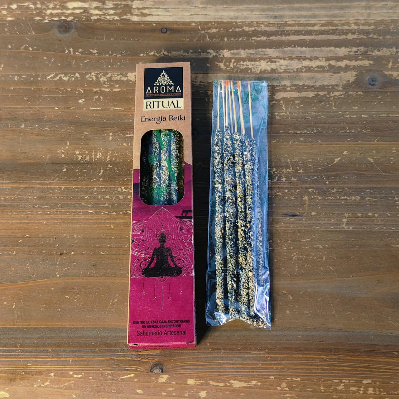 El Incienso Ritual Energia Reiki Aroma Aroma es un incienso artesanal disenado para amplificar y canalizar la energia Reiki. Presentado en cajita artesanal de 20g con mensaje inspirador, cada caja incluye un mensaje inspirador para acompanar tu practica.