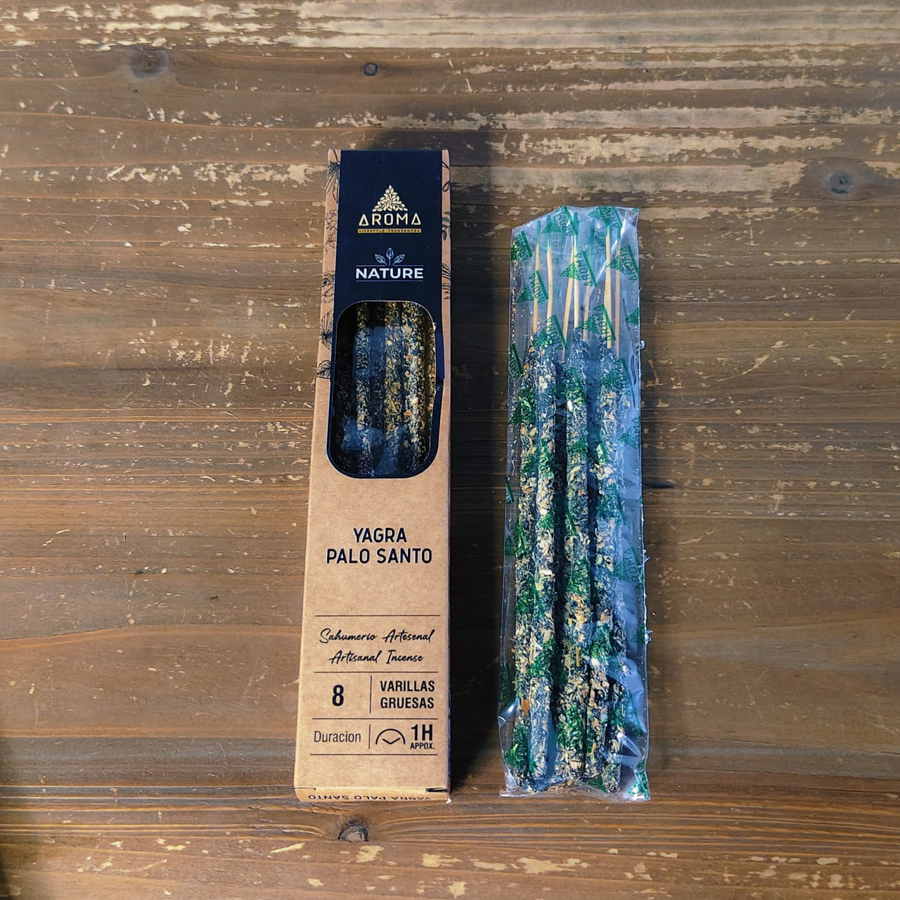 El Incienso Ritual Yagra Palo Santo Organico Aroma Nature Aroma es un incienso artesanal disenado para conectar con la energia purificadora del palo santo. Presentado en caja organica con 8 varillas artesanales de 1 hora de duracion, cada caja incluye un mensaje inspirador para acompanar tu practica.